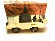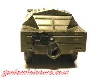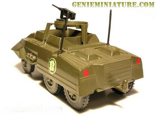 Un M20 en modèle réduit réalisé en zamak et matière plastique de couleur vert armée, dont la deuxième série possède toujours un crochet de remorque droit, mais les jantes sont maintenant en plastique. La mitrailleuse de type Browning 12.7 mm est en zamak peint de noir, les deux grandes antennes radio sont en plastique teinté de gris clair ou de rouge. Le châssis en zamak est serti, les décorations sont de types "US Army", comprenant une étoile blanche avec comme immatriculation "7 X 5 R". Cette vue de l'arrière permet de visualiser les feux de position peint en rouge et un crochet de remorque droit, qui est spécifique aux premières séries.